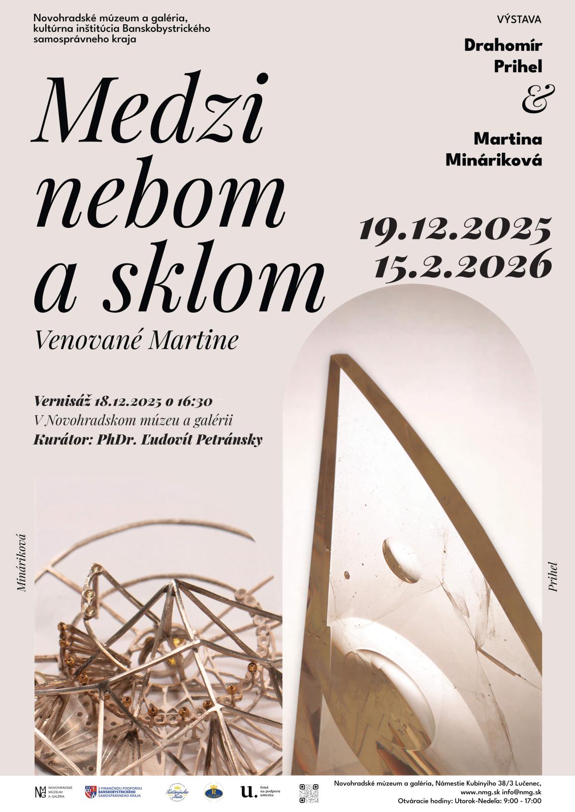 Novohradské múzeum a galéria, kultúrna inštitúcia Banskobystrického samosprávneho kraja, Vás pozýva na vernisáž výstavy „Medzi nebom a sklom“, ktorá sa uskutoční 18.12.2025 o 16:30.