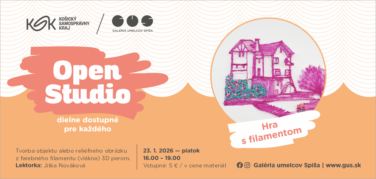 Galéria umelcov Spiša, kultúrne zariadenie Košického samosprávneho kraja, pozýva v piatok, 23. 1. 2026 v čase 16.00 – 19.00 na výtvarný workshop HRA S FILAMENTOM v rámci projektu OPEN STUDIO – dielne dostupné pre každého.