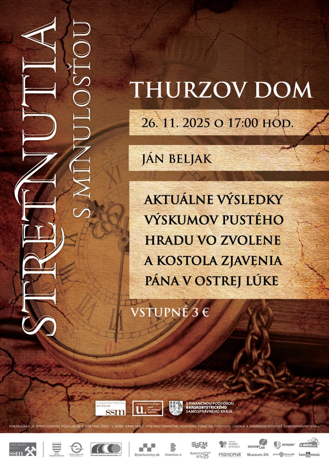 Stredoslovenské múzeum – kultúrna inštitúcia Banskobystrického samosprávneho kraja pripravila na 26.11.2025 o 17:00 h v Thurzovom dome pokračovanie cyklu prednášok Stretnutia s minulosťou. Archeológ Ján Beljak vo svojej prednáške odprezentuje aktuálne výsledky výskumov Pustého hradu vo Zvolene a kostola Zjavenia Pána v Ostrej Luke. Prednáška sprístupni aktuálne informácie o výsledkoch jedného z najväčších archeologických výskumov na Slovensku - Pustého hradu vo Zvolene.