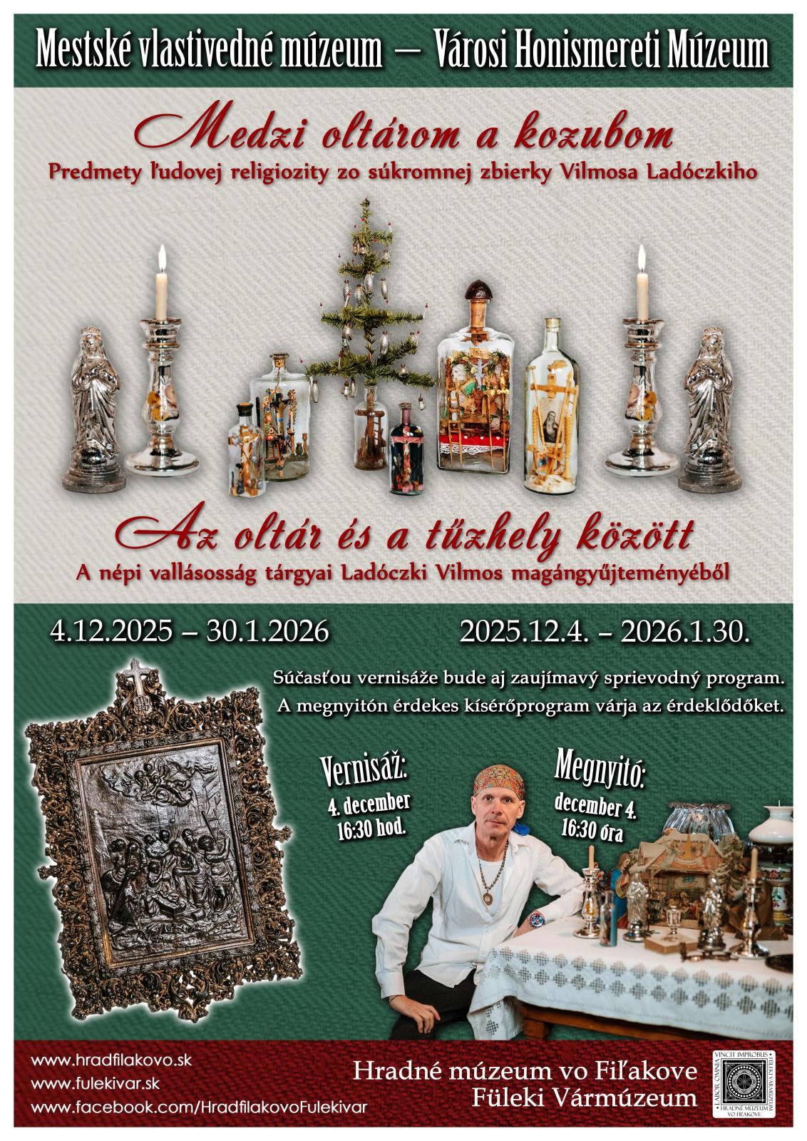 Mesiac december už tradične sprevádza posledná výstava roka v Mestskom vlastivednom múzeu vo Fiľakove. Tento rok sa tu 4. decembra 2025 o 16:30 hod. otvorí výstava s názvom „Medzi oltárom a kozubom – predmety ľudovej religiozity zo súkromnej zbierky Vilmosa Ladóczkiho“, ktorej predchodca bol pred dvomi rokmi uvedený v Balážskych Ďarmotách.