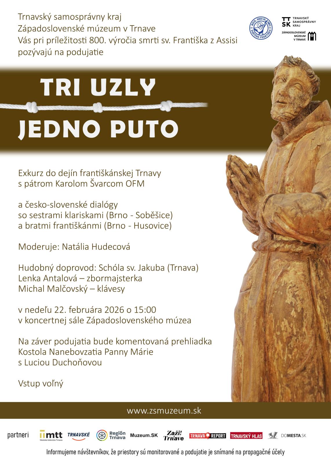 Pri príležitosti 800-ročného jubilea smrti sv. Františka a príchodu oboch rádov do Trnavy Vás srdečne pozývame na jedinečné stretnutie s bratmi františkánmi a sestrami klariskami do Západoslovenského múzea v Trnave, sídliaceho v bývalom kláštore klarisiek. V historickom exkurze predstaví brat Karol Švarc OFM prierez dejinami františkánskej Trnavy od 13. storočia po súčasnosť. V česko-slovenskej besede (moderuje Natália Hudecová) sa od bratov Bernarda (CZ) a Karola (SK) a sestier Benedikty (CZ) a Simeony (SK) dozviete pútavé informácie o duchovnej, kultúrnej, umeleckej, vedeckej, sociálnej a pedagogickej činnosti synov sv. Františka a dcér sv. Kláry.