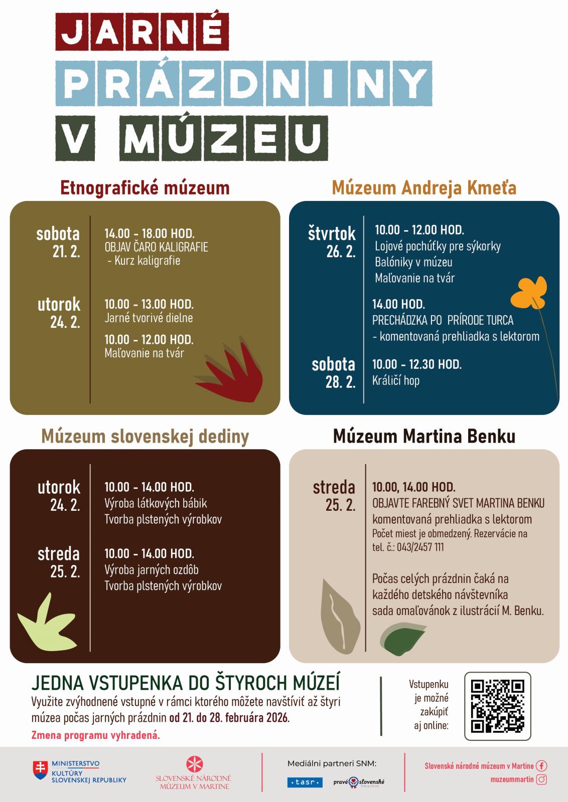 V dátume od 21. do 28. februára 2026 sa brány Etnografického múzea, Múzea Andreja Kmeťa, Múzea slovenskej dediny a Múzea Martina Benku otvoria všetkým, ktorí chcú spojiť voľný čas s kreativitou, prírodou, históriou ale aj zábavou.