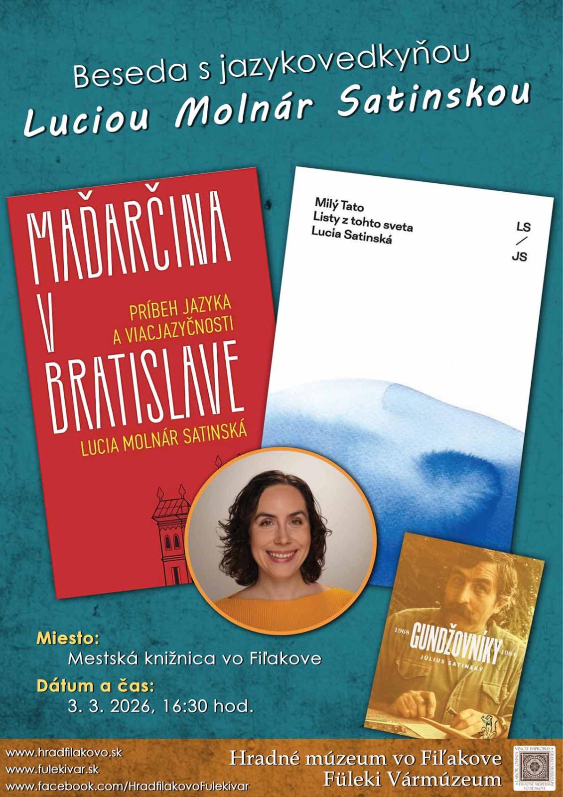 Marcovým hosťom Mestskej knižnice vo Fiľakove bude známa slovenská jazykovedkyňa, prekladateľka a spisovateľka PhDr. Lucia Molnár Satinská, PhD. Bratislavská autorka vyštudovala na Filozofickej fakulte Karlovej univerzity v Prahe a od roku 2011 pôsobí v Jazykovednom ústave Ľudovíta Štúra SAV.