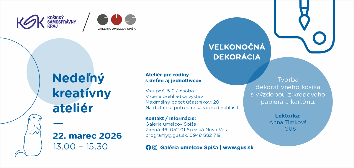 Galéria umelcov Spiša, kultúrne zariadenie Košického samosprávneho kraja, pozýva v nedeľu, 22. 3. 2026 v čase 13.00 15.30, na výtvarný ateliér určený pre rodiny s deťmi i jednotlivcov.