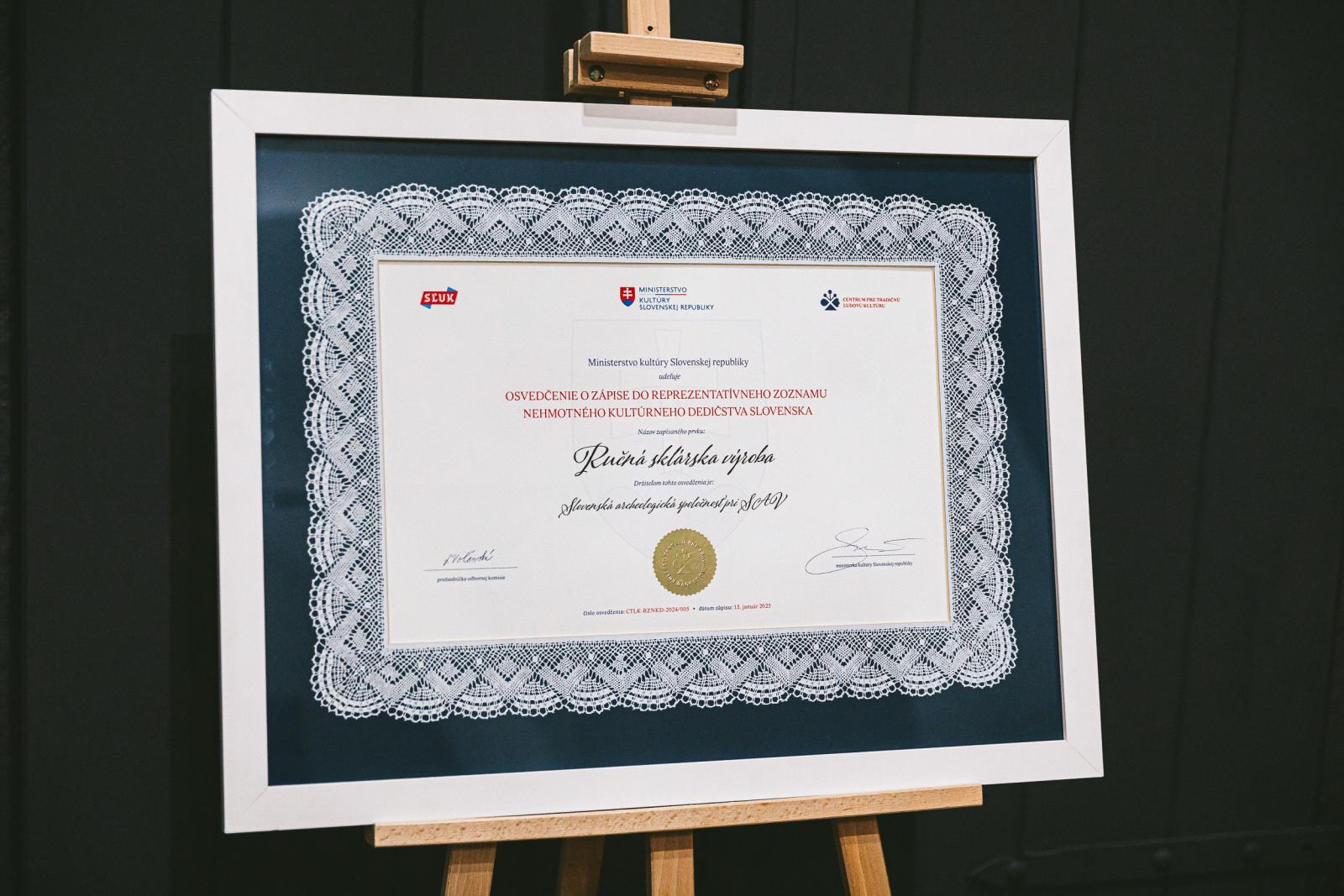 Osvedčenie o zápise Ručnej sklárskej výroby do Reprezentatívneho zoznamu nehmotného kultúrneho dedičstva Slovenska bude vystavené v Malokarpatskom múzeu v Pezinku do konca marca 2026.