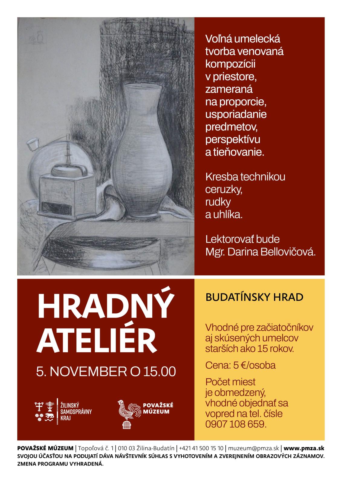„Budeme sa venovať kresbe kompozície v priestore, pri ktorej sa zameriame na jej proporcie a usporiadanie predmetov, perspektívu a tieňovanie. Kresba, ktorá zahŕňa techniku ceruzky, rudky a uhlíka, patrí k najstarším technikám a k základným zručnostiam umelca, ktorý pomocou nej dokáže vyjadriť nielen presnosť videného predmetu, ale aj vlastné pocity a myšlienky,“ približuje Darina Bellovičová z Považského múzea.