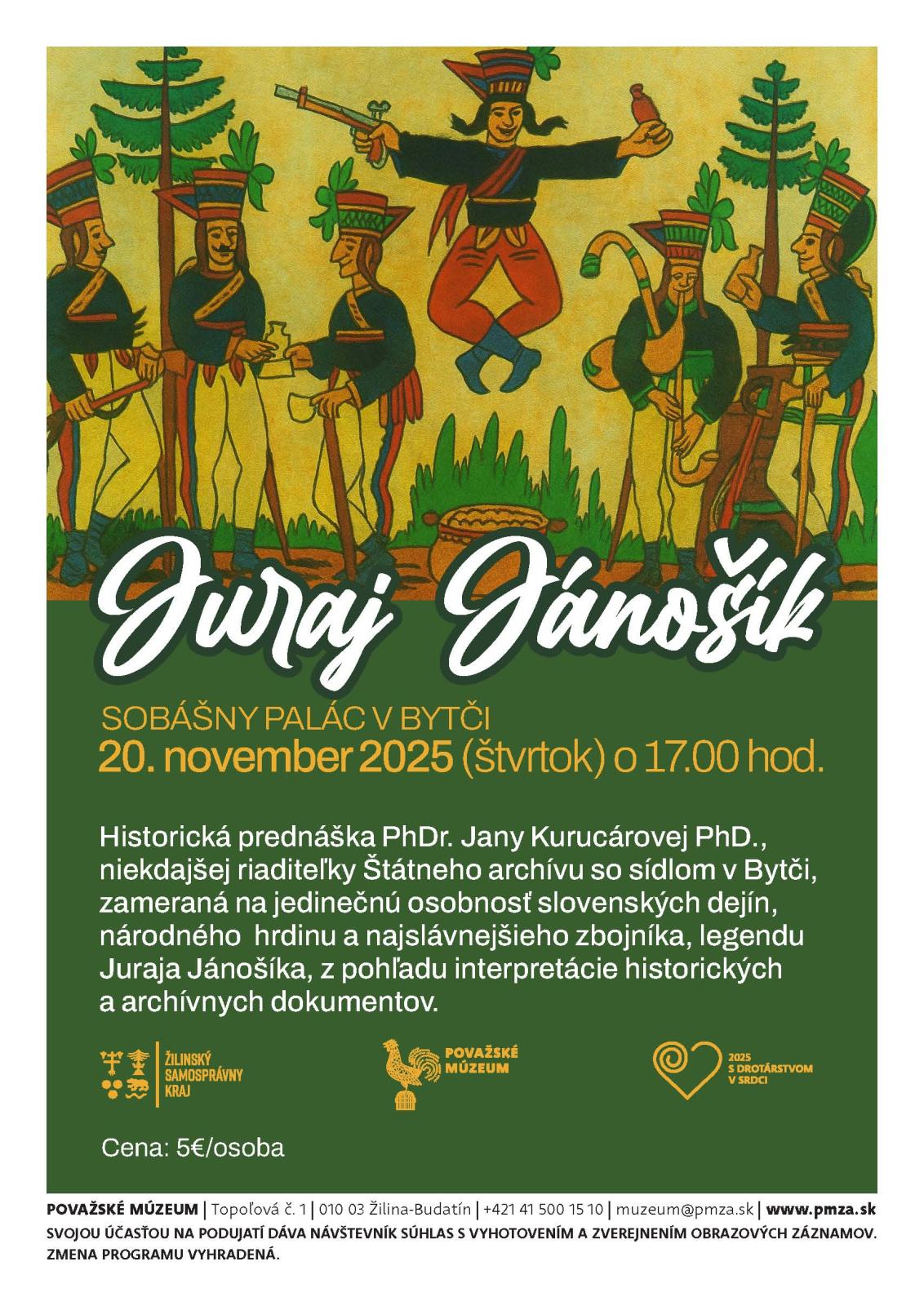 Historická prednáška PhDr. Jany Kurucárovej PhD., niekdajšej riaditeľky Štátneho archívu so sídlom v Bytči, zameraná na jedinečnú osobnosť slovenských dejín,  národného  hrdinu a najslávnejšieho zbojníka, legendu Juraja Jánošíka, z pohľadu interpretácie historických a archívnych dokumentov.